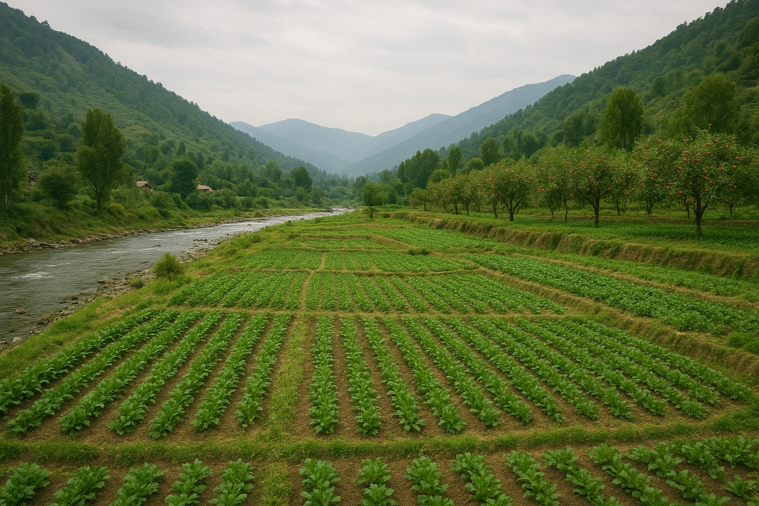 Fields of vegetables and sprawling apple orchards dominate the scenery, while the community thrives on the seasonal harvests and the bounty of the Kandi Nallah.